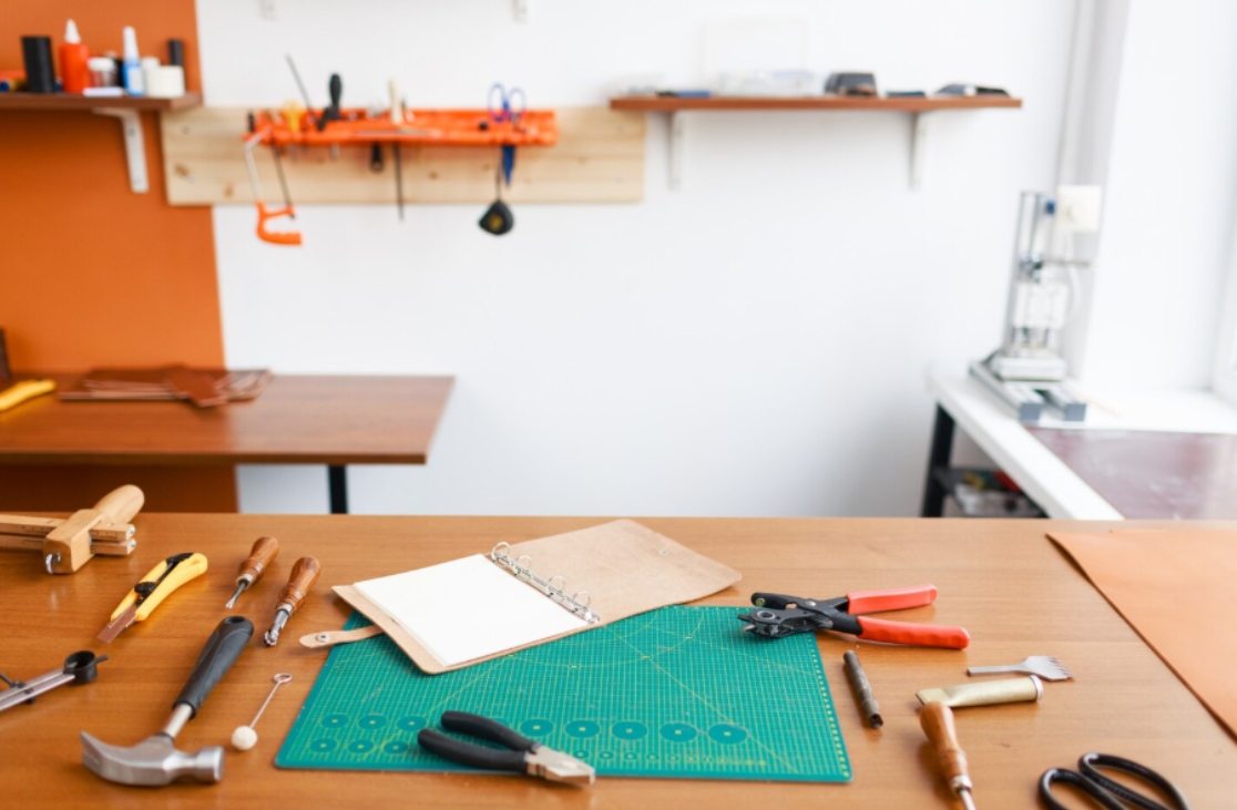 - Прочные металлические или деревянные стеллажи для инструментов, материалов и готовых изделий.