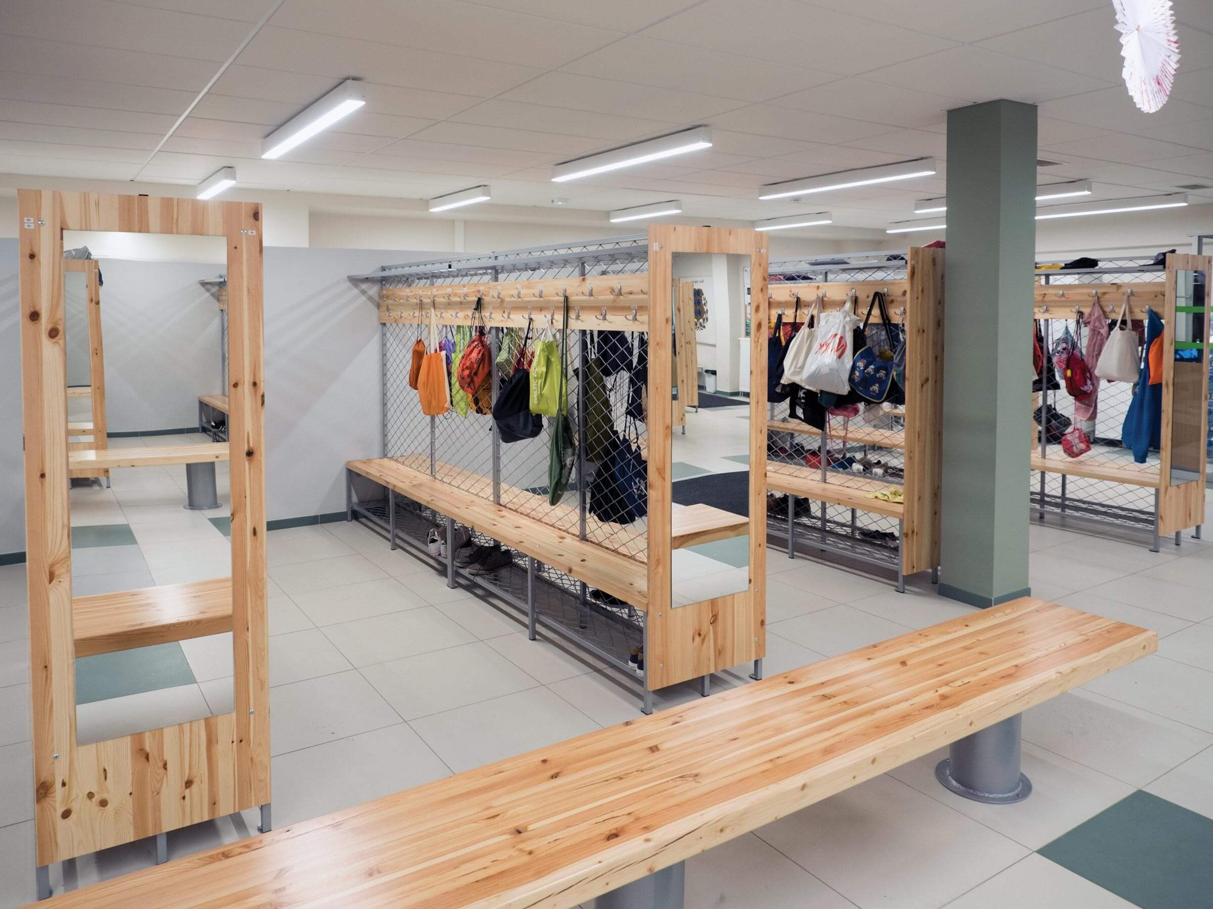 В зоне гардероба для переодевания младших классов рекомендовано установить лавки или пуфы. Их можно совместить с полками для обуви.