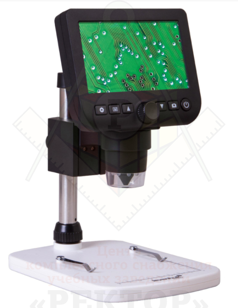 В качестве объектива в микроскопе выступает цифровая камера с сенсором 0,3 Мпикс. Она формирует картинку и выводит ее на встроенный ЖК-экран. Кроме того, доступна функция фото- и видеозаписи. Качество изображения настраивается программно. Для хранения записанных материалов используется карта памяти – она включена в комплект поставки. В комплекте есть и диск с программой для обработки снимков. Она устанавливается на компьютер и позволяет управлять яркостью и контрастностью изображения, наносить надписи на фотоснимки, измерять угловые и линейные размеры образцов.