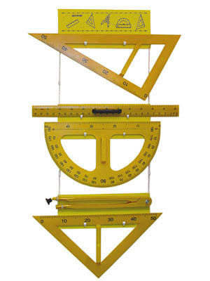 В комплект входят: линейка 60 см (цена деления 1 см, оцифровка через 5 см) – 1 шт., угольник с углами 30 градусов. и 60 градусов – 1 шт., угольник с углами 45 градусов – 1 шт., циркуль с держателем для мела и резиновой присоской – 1 шт., транспортир с прямой и обратной шкалами от 0 градусов до 180 градусов – 1 шт., пластины для крепления комплекта на стене – 3 шт., шурупы – 2 шт., дюбели – 2 шт., руководство по эксплуатации – 1 шт.