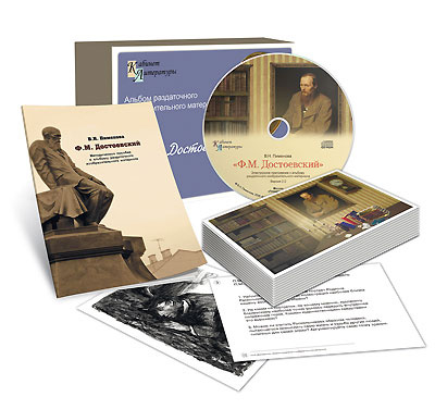CD-диск пособия включает в себя текстовый и изобразительный материал, посвященный творчеству Ф.М. Достоевского: портрет писателя, иллюстрации к произведениям «Преступление и наказание», «Белые ночи»; вопросы и задания.