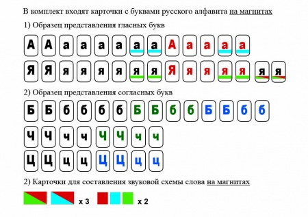 400 карточек (7х10 см) с изображением цветных букв русского алфавита и карточек-схем для фонетического разбора слова и графического анализа; 400 магнитов на клеевой основе