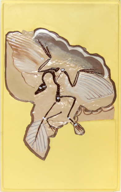 Модель изготовлена из пластмассы путём вакуумного формования. Изображает слепок с археологической находки. Модель раскрашена в соответствии с археологической находкой археоптерикса, найденного в отложениях середины мезозойской эры. На модели изображен отпечаток археоптерикса. Эта первоптица представляет собой переходную форму, имеющую в своем строении признаки птицы с сохранившимися еще чертами пресмыкающегося. Находка археоптерикса в сланцах юрского периода мезозойской эры представляет большой интерес с эволюционной точки зрении.