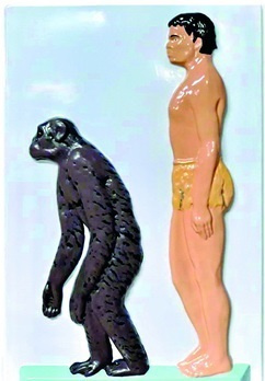 Модель изготовлена из пластмассы путём вакуумного формования. На ней изображены современный человек и шимпанзе в вертикальном положении. Модель позволяет выявить черты сходства и различия в строении человека и животных.