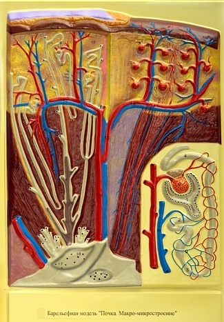 Модель изготовлена из пластмассы, путем вакуумного формования. Модель изображает строение почки человека на гистологическом уровне. Модель окрашена в естественные цвета. На модели обозначены следующие особенности строения почки и почечного нефрона: