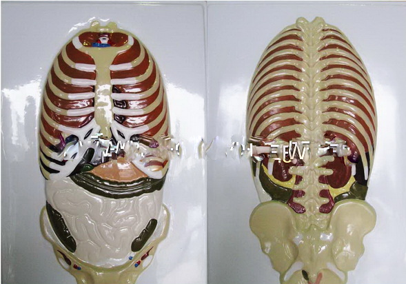 Модель изготовлена из пластмассы путём вакуумного формования. В комплект входят 2 планшета, на которых изображено расположение внутренних органов в грудной и брюшной полостях тела человека. На одной модели расположение органов демонстрируется с брюшной стороны, а на другой – со спинной.