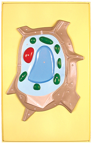 Модель изготовлена из пластмассы путём вакуумного формования. Пособие дает возможность получить знания о главных частях растительной клетки и их взаимном расположении. На пособии изображены: оболочка (клеточная стенка), поры, цитоплазма, ядро, вакуоль с клеточным соком, хлоропласты.