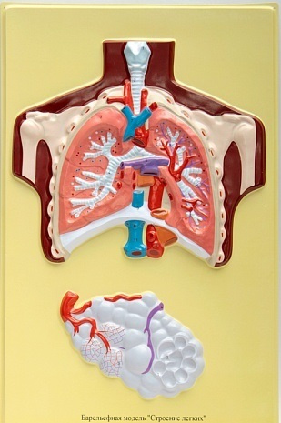 Модель изготовлена из пластмассы путём вакуумного формования.На данной модели изображено внутреннее строение легких человека, строение легочных пузырьков. Даны два рельефных изображения, на которых можно рассмотреть: