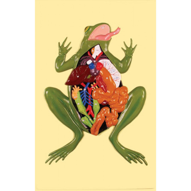 Изображает лягушку со вскрытой брюшной полостью, демонстрирует ее внутреннее строение. На модели можно рассмотреть следующие органы и части тела: