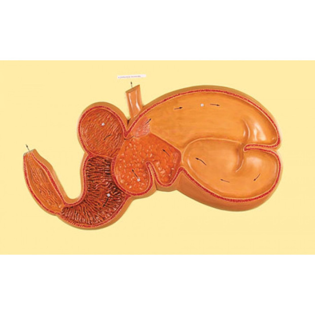 Модель изготовлена из пластмассы путём вакуумного формования. Окраска изображения близка к естественной (розовато-коричневого цвета). На барельефной модели можно рассмотреть особенности строения пищеварительного тракта парнокопытных и выделить следующие органы пищеварения: - пищевод;