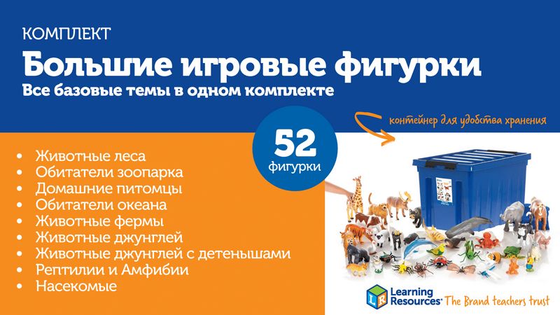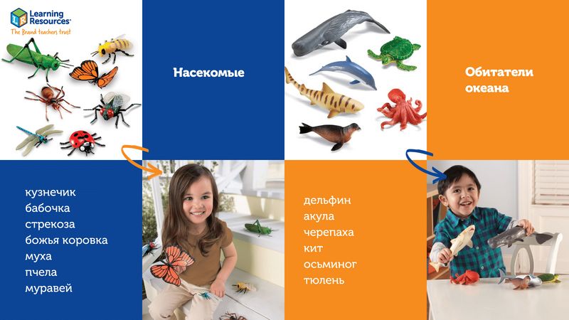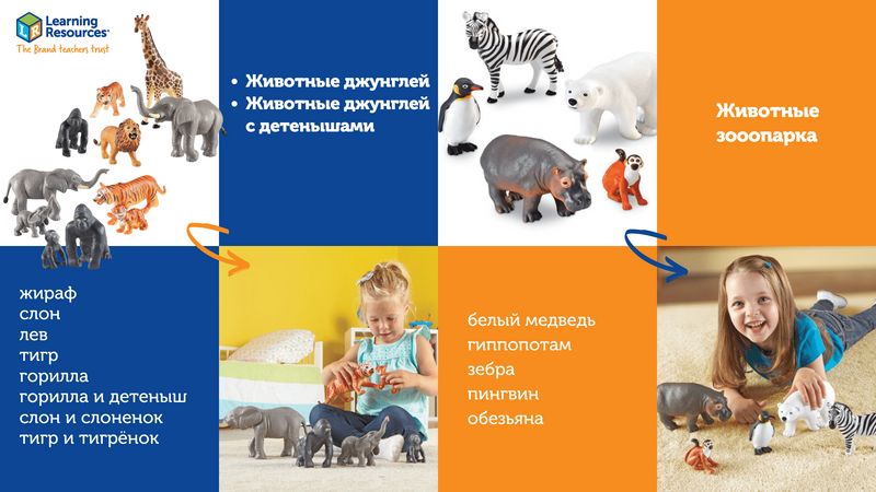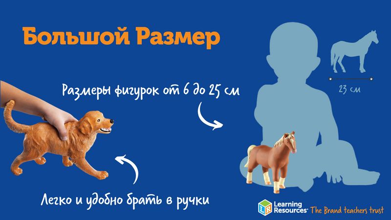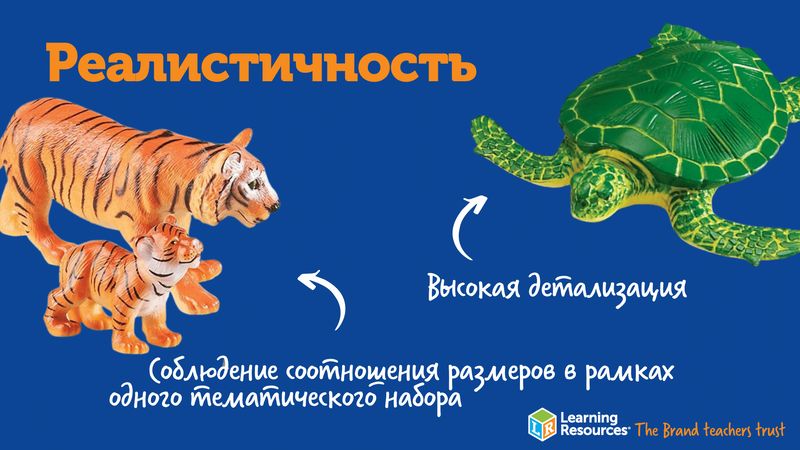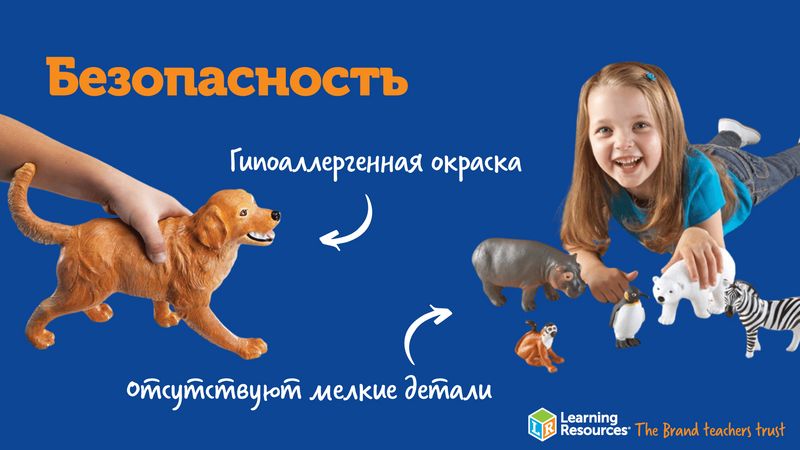 До 2 лет детям просто необходимо исследовать окружающий мир посредством тактильной чувствительности — то есть, при помощи пальчиков или языка. Не случайно малыши стремятся все тянуть в рот! Фигурки Learning Resources сделаны из экологически чистых материалов, их вполне можно изучить и таким способом — это не принесет ребенку вреда, зато доставит ему массу удовольствия. Трогая фигурки животных пальчиками и тщательно ощупывая их со всех сторон, малыши узнают много нового о внешних отличительных признаках животных и смогут развить мелкую моторику.
