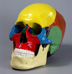 Модель высотой ≈ 16см, изготовлена из пластмассы. Модель позволяет продемонстрировать расположение костей черепа. Отдельные кости выделены различными цветами, что позволяет четко различать их границы. На модели можно рассмотреть: 1. Лицевой отдел черепа: верхнечелюстные кости, нижняя челюсть, скуловые кости. 2. Мозговой отдел черепа: лобная кость, теменные кости, затылочная кость, височные кости, клиновидные кости, решетчатая кость.