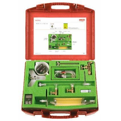 В комплекте (для 1 рабочей группы или для демонстрации)*: водонапорный бак, резервуар для воды, стояк с двумя кранами, центробежный насос с блоком питания (батарея 4,5 В), сборный штатив на треноге, аксессуары.