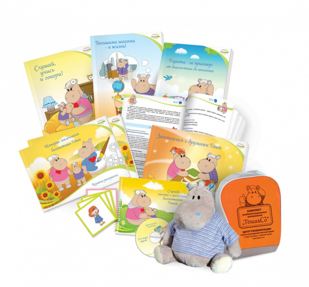 Комплект реабилитационных материалов создан ведущими мировыми и отечественными специалистами в области кохлеарной имплантации, слухопротезирования, сурдологии, аудиологии и реабилитации нарушенной слуховой функции. Материалы Комплекта прошли адаптацию и коррекцию с учетом особенностей русского языка, специфики работы с данной категорией пациентов, а также общих нормативов специальной педагогики при участии ведущих педагогов Центра реабилитации после кохлеарной имплантации «Тоша&Co» г. Фрязино Московской области (Мунтян Е.В., Мельниковой Л.А. и Рябчиковой А.Л.).Все пособия имеют уникальный стилизованный дизайн. Сюжетная линия Комплекта раскрывает историю маленького бегемотика Тоши, глухого с рождения, и его семьи, которая, вместе с ним, проходит по всем ступенькам реабилитации после кохлеарной имплантации.Об особенностях педагогической работы рассказывает каждое пособие: с чего начинать и к чему стремиться, какие ставить цели и как их достигать совместными усилиями специалистов и родителей.
