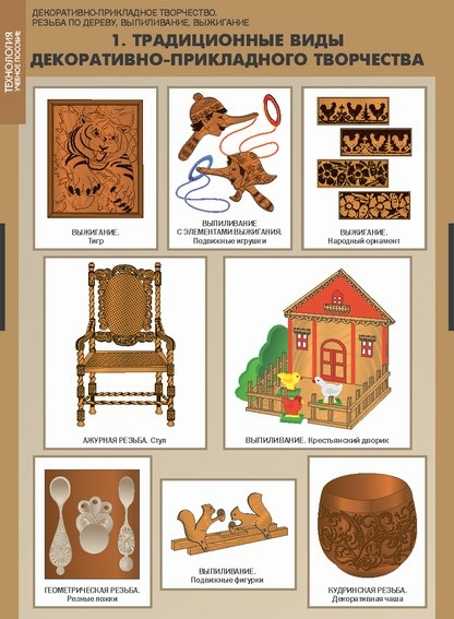 Традиционные виды декоративно-прикладного творчества. Инструменты и приспособления для выпиливания. Технология выпиливания. Сборка изделия. Инструменты и приспособления для выжигания. Технология выжигания. Виды выжигания. Правила безопасного труда при выпиливании и выжигании. Инструменты и приспособления для резьбы по древесине. Резьба по тонированной древесине. Виды плоскорельефной резьбы. Правила безопасного труда при резьбе.
