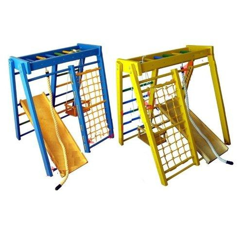 В комплект входит канат для лазания, горка, страховочный мат, сетка - скалодром, рукоход, кольца, качели.