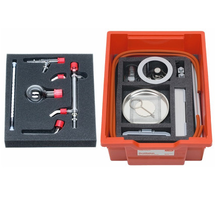 В комплекте (для 1 рабочей группы или для демонстрации)*: колба, мензурка, холодильник Либиха, термометр, держатели, штатив, спиртовка, резиновые трубки, аксессуары.