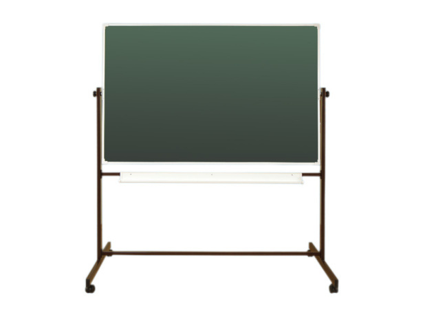 Доска напольная поворотная с 2-мя рабочими поверхностями для письма мелом. Рабочая поверхность изготовлена из стального эмалированного листа, благодаря чему имеет высокую износоустойчивость и прочность. Торцы окантованы окрашенным металлическим профилем, замкнутым по контуру угольниками из ударопрочного полистирола. Доска оборудована винтовыми узлами зажима, которые позволяют поворачивать рабочую поверхность на 360 градусов и фиксировать её в необходимом положении. Каркас доски изготовлен из трубы прямоугольного сечения и снабжен колесными опорами, позволяющими перемещать доску в необходимое место. Одна пара колесных опор имеет механизм фиксации для обеспечения неподвижности доски. Стальная основа доски даёт возможность крепления наглядных учебных пособий к поверхности с помощью магнитов. Внизу доски на поперечной штанге, соединяющей между собой две стойки, крепится лоток для мела.