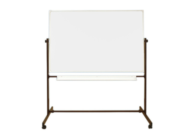 Доска напольная поворотная с 2-мя рабочими поверхностями для письма мелом и маркером. Рабочая поверхность изготовлена из стального эмалированного листа, благодаря чему имеет высокую износоустойчивость и прочность. Торцы окантованы окрашенным металлическим профилем, замкнутым по контуру угольниками из ударопрочного полистирола. Доска оборудована винтовыми узлами зажима, которые позволяют поворачивать рабочую поверхность на 360 градусов и фиксировать её в необходимом положении. Каркас доски изготовлен из трубы прямоугольного сечения и снабжен колесными опорами, позволяющими перемещать доску в необходимое место. Одна пара колесных опор имеет механизм фиксации для обеспечения неподвижности доски. Стальная основа доски даёт возможность крепления наглядных учебных пособий к поверхности с помощью магнитов. Внизу доски на поперечной штанге, соединяющей между собой две стойки, крепится лоток для мела и маркеров.