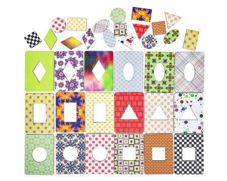 В наборе 18 планшетов с выемками по середине - квадратами, овалами, кругами, прямоугольниками, ромбиками, треугольниками.