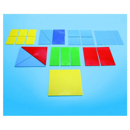 Набор пластиковых квадратов, разделенных на части. Демонстрируют деление квадрата на 2, 3, 4 и 6 частей в виде прямоугольников, треугольников и квадратов.