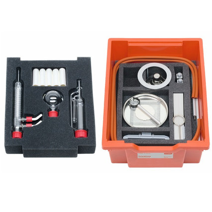 В комплекте (для 1 рабочей группы или для демонстрации)*: колба, экстрактор Сокслета, холодильник Димрота, гильзы экстрактора, штатив, стопор, керамическая сетка, спиртовка, мензурка, резиновые трубки, аксессуары.