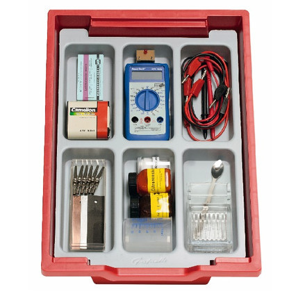 В наборе (на 1 рабочую группу или для демонстраций)*: стакан, стержень мешалки, гидрат лимонной кислоты, сульфат меди, угольные электроды, свинцовый электрод, цинковый электрод, медный электрод, железный электрод, миниатюрный электромотор, индикаторный светодиод, соединительные провода, аксессуары.