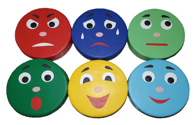 На диски нанесены аппликации, изображающие основные эмоции: радость, грусть, гнев, удивление, спокойствие, счастье.Выберите диск с эмоцией, расскажите, как она называется, какие чувства испытываете, в каких ситуациях, придумайте схожие и отличные настроения. Эмоционально-развивающие игры играют важную роль в жизни детей, в социализации и подготовке к школьной жизни. Неразвитая эмоциональная сфера тормозит развитие интеллектуальных процессов, поэтому необходимо уделять внимание развитию эмоционального мира малыша, его чувств, эмоций, коммуникативных способностей, т.е. развивать эмоциональный интеллект, учить его пониманию себя и других.Материал: винилискожа (ВИК, искусственная кожа), поролон. Игры-упражнения:НастроениеРебёнку задается вопрос «Какое у тебя сегодня настроение?», и он выбирает соответствующий диск. Усложняем игру: «Таня поссорилась со своей лучшей подружкой Олей. Как ты думаешь, какое у неё сейчас настроение? Что она чувствует?» и т.п.Поделись улыбкою своейРебёнок вместе с родителями, воспитателями, детьми по очереди рассказывают, в каких ситуациях они радуются, боятся, огорчаются, удивляются и т.д.Калейдоскоп настроенийНа столе, полу раскладываются диски картинкой вниз. Ребенок берет одну диск, не показывая его никому. Затем ребенок должен узнать эмоцию и изобразить ее с помощью мимики, пантомимики, голосовых интонаций. Остальные отгадывают изображенную эмоцию.Усложняем игру: Ребёнок показывает любую эмоцию, а остальные угадывают!Герои сказокПросмотр мультфильмов, чтение литературы с последующим обсуждением чувств героев. Обсудите поведение, чувства и эмоции героев сказок: «Как ты думаешь, что почувствовали бабка и дедка когда вытянули репку? «Как ты считаешь, какое настроение было у зайки, когда его выгнала лиса из лубяной избушки?» и т.п. Упражнения на развитие эмоциональной сферы помогают лучше понять свои чувства, переживания и внутреннее состояние другого человека. В процессе игры ребенок учится различать эмоции, их внешние проявления, учится управлять мимикой, пантомимикой.