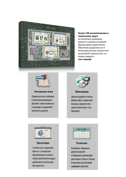 Комплекс разработан, чтобы преподавать современную и жизненно важную дисциплину, согласно Распоряжению Правительства Российской Федерации “О повышении финансовой грамотности населения”. Дополнительные возможность: Презентации, Расписание, электронные книги, мультимедиа.