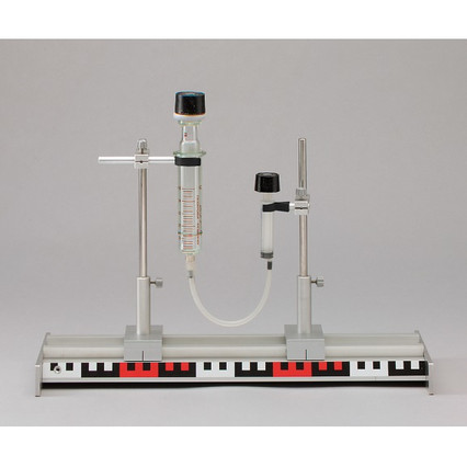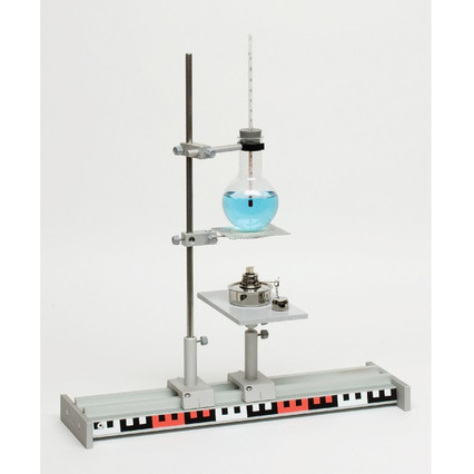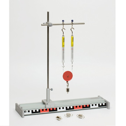 Основные элементы - рельсовый профиль с опорами, ползунковые фиксаторы, головки, кольцо штатива, фиксаторы, стол, весы с указателем, рулетка, весы, набор разновесов.