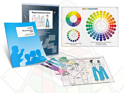 Наглядно-методические материалы комплекта иллюстрируют способы моделирования брюк различных фасонов: «бермуды», «кюлоты», «капри», «клеш», юбка-шорты, брюки зауженные книзу, брюки с различными вставками, брюки с кокеткой и т.д.; Для помощи в выборе цветового решения в комплект включен кодотранспарант со схемой цветоделения.