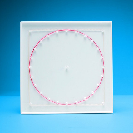 Игровое поле геоборда – пластиковый планшет с выступающими колышками, расположенными с одинаковыми промежутками по горизонтали и вертикали, за которые можно цеплять входящие в набор резинки и «рисовать» геометрические фигуры. С одной стороны игрового поля расположена сетка колышков с промежутками в 3 см. С обратной стороны доски колышки расположены по окружности.