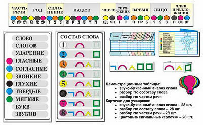 Комплект учебных наглядных пособий включает в себя 3 демонстрационных пособия для учителя и 4 набора по 28 карточек раздаточного материала для учащихся. Комплект пособий используется на всем протяжении обучения ученика в начальной школе.