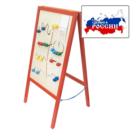 В прорезях деревянного мольберта находятся 20 цветных фишек. Перемещая фишки по прорезям, можно создавать разные узоры: либо по образцу из блокнота заданий, либо самостоятельно. Двигать фишки можно двумя или любой одной рукой. Игра предназначена для развития навыка ориентировки в пространстве, усвоения понятий "лево-право", "вверх-вниз", "симметрия". Она развивает умение различать цвета, вырабатывает навык следования вербальной или графической инструкции, самоконтроль. Большие возможности игра предоставляет для развития стратегического мышления.