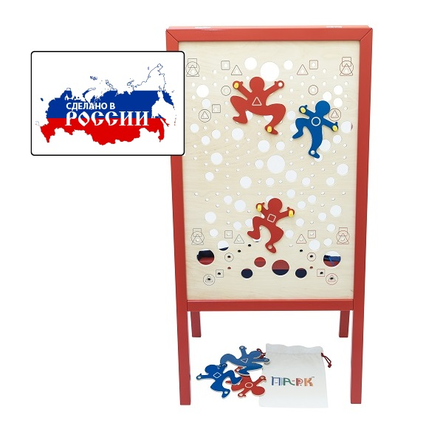 Мольберт с прорезями в виде кругов различного диаметра, по которому "карабкаются" деревянные фигурки человечков. Управлять их движением можно при помощи штырьков, которые фиксируются в отверстиях мольберта. Игроку нужно как можно быстрее довести своего человечка от стартовой позиции до финиша.