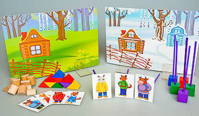 Комплектность: декорации формата А4 – 2 шт., карточки с персонажами формата 7*5 см – 8 шт., крепления для персонажей сказок – 8 шт., полуцилиндр неокрашенный – 12 шт., полуцилиндр окрашенный – 4 шт., призма треугольная неокрашенная -12 шт., призма треугольная окрашенная - 12 шт., держатели для декораций – 4 шт., скотч двухсторонний – 1 компл., руководство по эксплуатации – 1 шт., методические рекомендации для педагогов ДОО («Хрестоматия для дошкольников “Русские народные сказки”. Использование игровых наборов Фрёбеля при реализации ФГОС ДО». Авторы: В.В. Кожевникова, В.А. Киселева – 28 страниц – печать офсетная, обложка полноцвет.) - 1 шт.