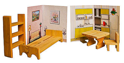 Декорации представляют собой полноцветные карточки формата А4, изготовленные из картона и ламинированные пленкой. Служат для конструирования интерьера спальни, гостиной и кухни. Держатели пластиковые, прозрачные, не закрывают изображений и надежно удерживают декорации в вертикальном положении. Мебель изготовлена из дерева, не окрашена.