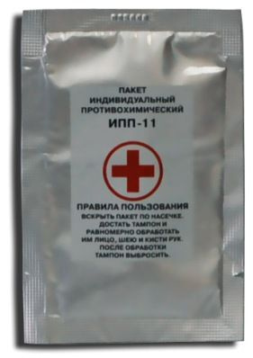 Индивидуальный противохимический пакет ИПП-11 предназначен для профилактики поражений кожных покровов капельно-жидкими отравляющими и химически опасными веществами через открытые участки кожи, а также для нейтрализации этих веществ на коже и одежде человека, СИЗОД и инструментах в интервале температур от +50оС до -20оС. При заблаговременном нанесении на кожу защитный эффект сохраняется в течение 24 часов. Форма выпуска: герметичный пакет, содержит тампон из нетканого материала, пропитанный противохимическим средством.На одну обработку открытых участков кожи используется один пакет.