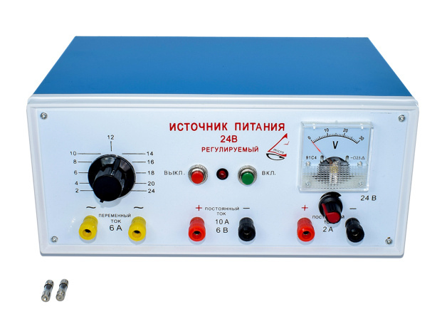 Блок питания 24 В регулируемый предназначен для питания электроустановок при постановке демонстрационных опытов. Он позволяет плавно регулировать напряжение от 0 до 30 В переменного тока и от 0 до 24 В постоянного тока.