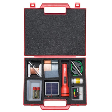 В наборе (для 1 рабочей группы или для демонстраций)*: индикатор напряжения, солнечный элемент, фонарик, провода со штекерами, ванны для электролиза, медный и цинковый электроды, лимонная кислота, пробирки, магнитный стержень, аксессуары.