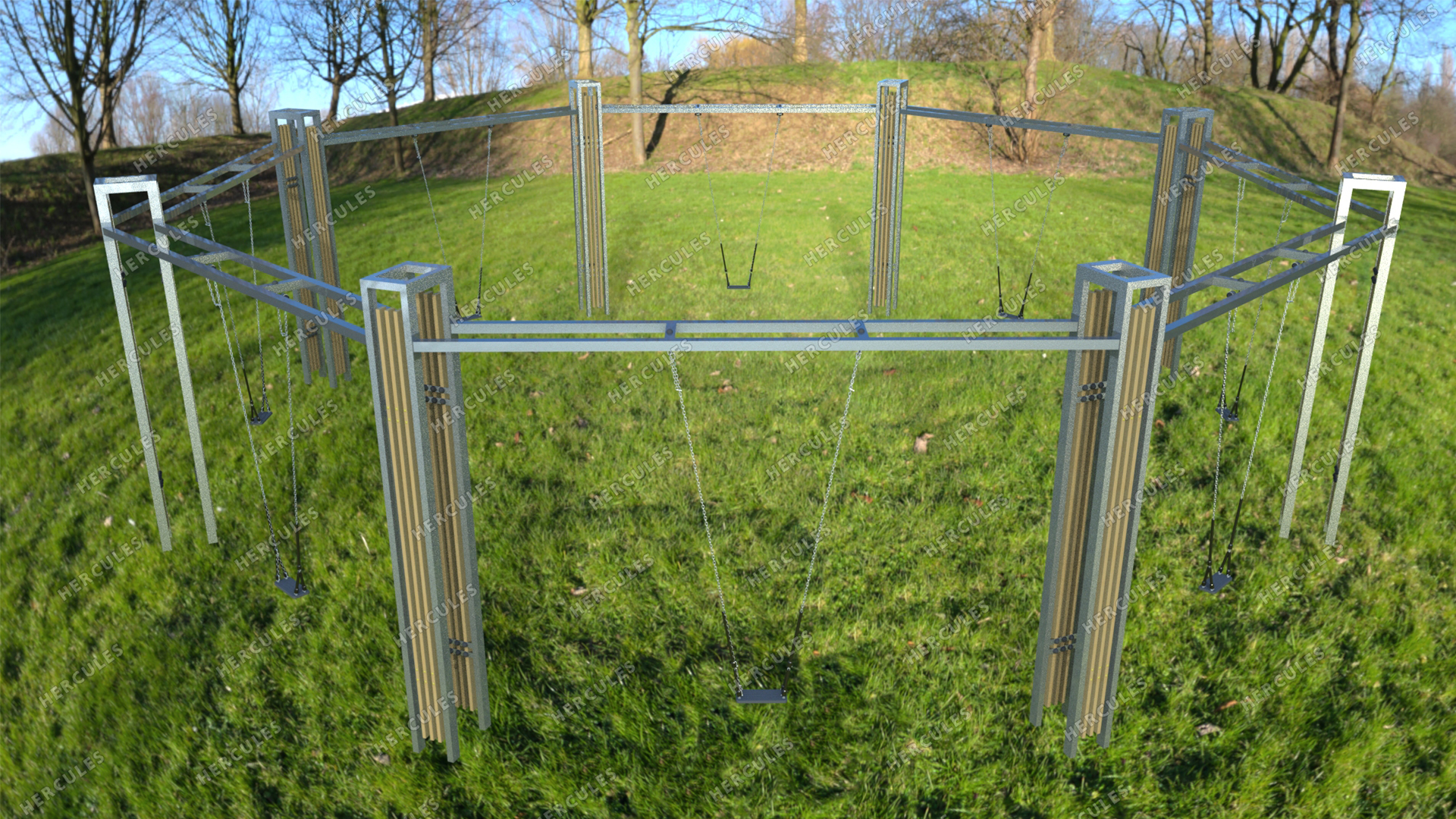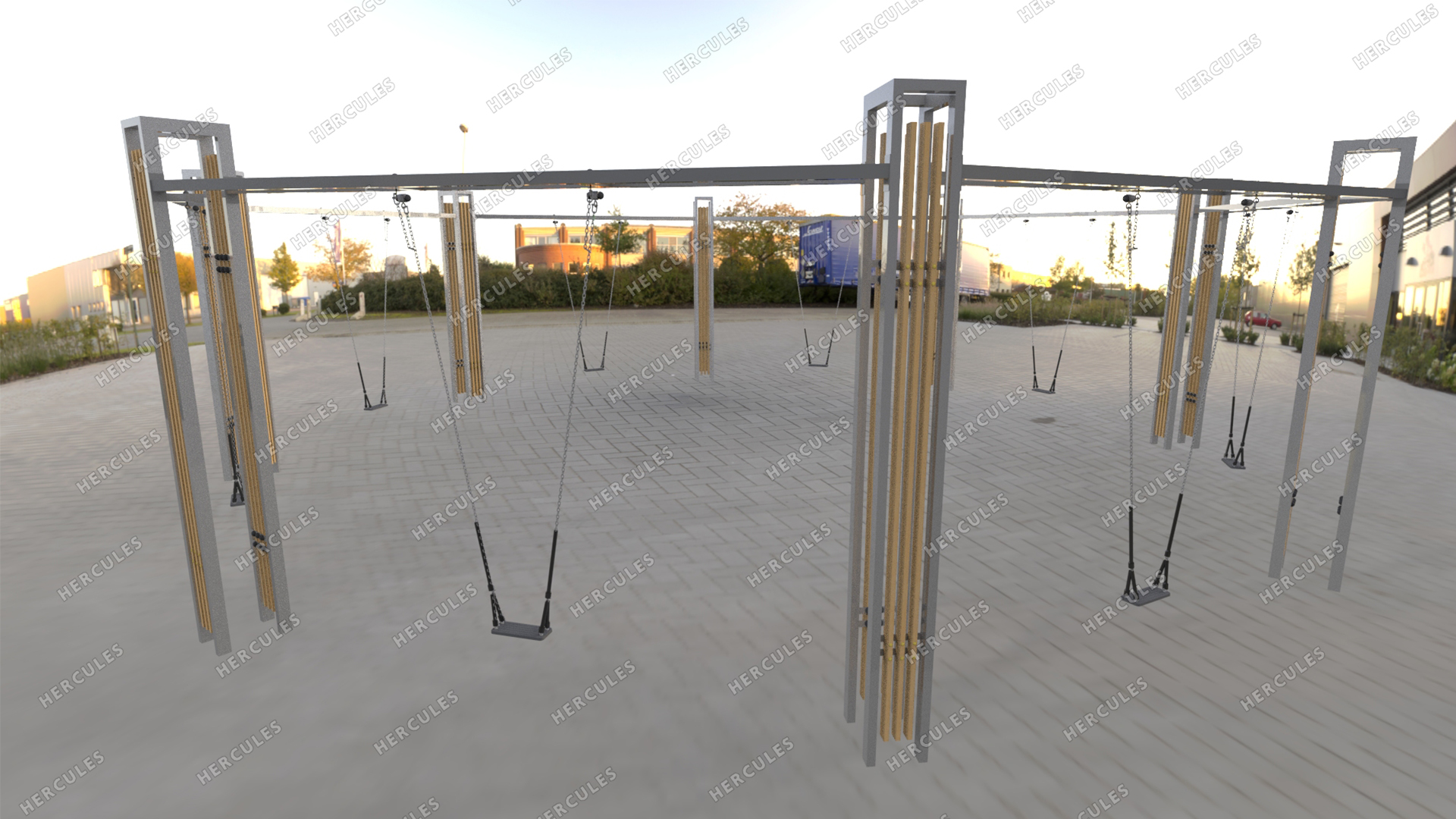 Сталь с порошковой окраской, дерево, обрезиненные сидения на оцинкованных цепях.