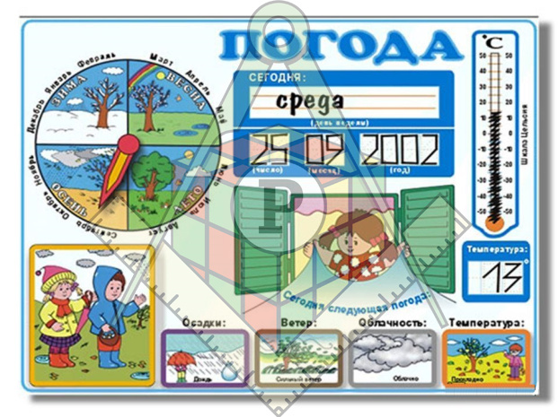 Должен состоять из настенного планшета с изображением четырех времен года с указанием названий месяцев. В наличии: термометр, не менее 16 маленьких съемных карточек с изображением природных явлений и погодных условий, не менее 4 больших съемных карточек с изображением детей на улице в разные времена года. Материал: пластик. Размер планшета: длина не менее 500 мм и не более 600 мм, ширина не менее 400 мм и не более 450 мм.