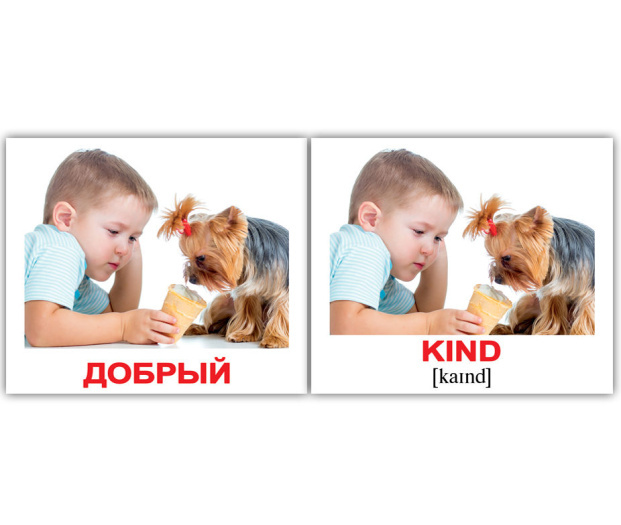 Набор карточек состоит из 40 двусторонних карточек с фотографиями объектов, с подписями на английском языке. На обороте - те же картинки с подписями на русском языке.
