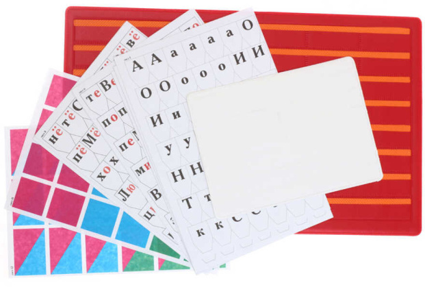 Касса состоит из папки формата А5 , внутри которой - ряды с карманчиками, демонстрационной карточки из ПВХ и картонной кассы с буквами, слогами и цифрами.