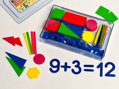 Комплектность: квадраты – 10 шт., шестигранники – 10 шт., круги – 10 шт., прямоугольники – 10 шт., треугольники большие – 20 шт., треугольники малые – 20 шт., счетные палочки – 20 шт., цифры – 20 шт., знаки – 12 шт.
