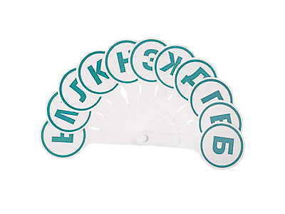 Изготовлена из пластмассы. Представляет собой комплект пластинок, соединенных аналогично соединению деталей веера, с буквами, обозначающими согласные звуки русского языка. Буквы выполнены крупным шрифтом и нанесены яркой краской.