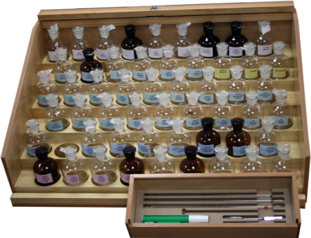 Предназначено для хранения до 54 флаконов с реактивами в виде растворов, порошков и твердых веществ на демонстрационном столе учителя.