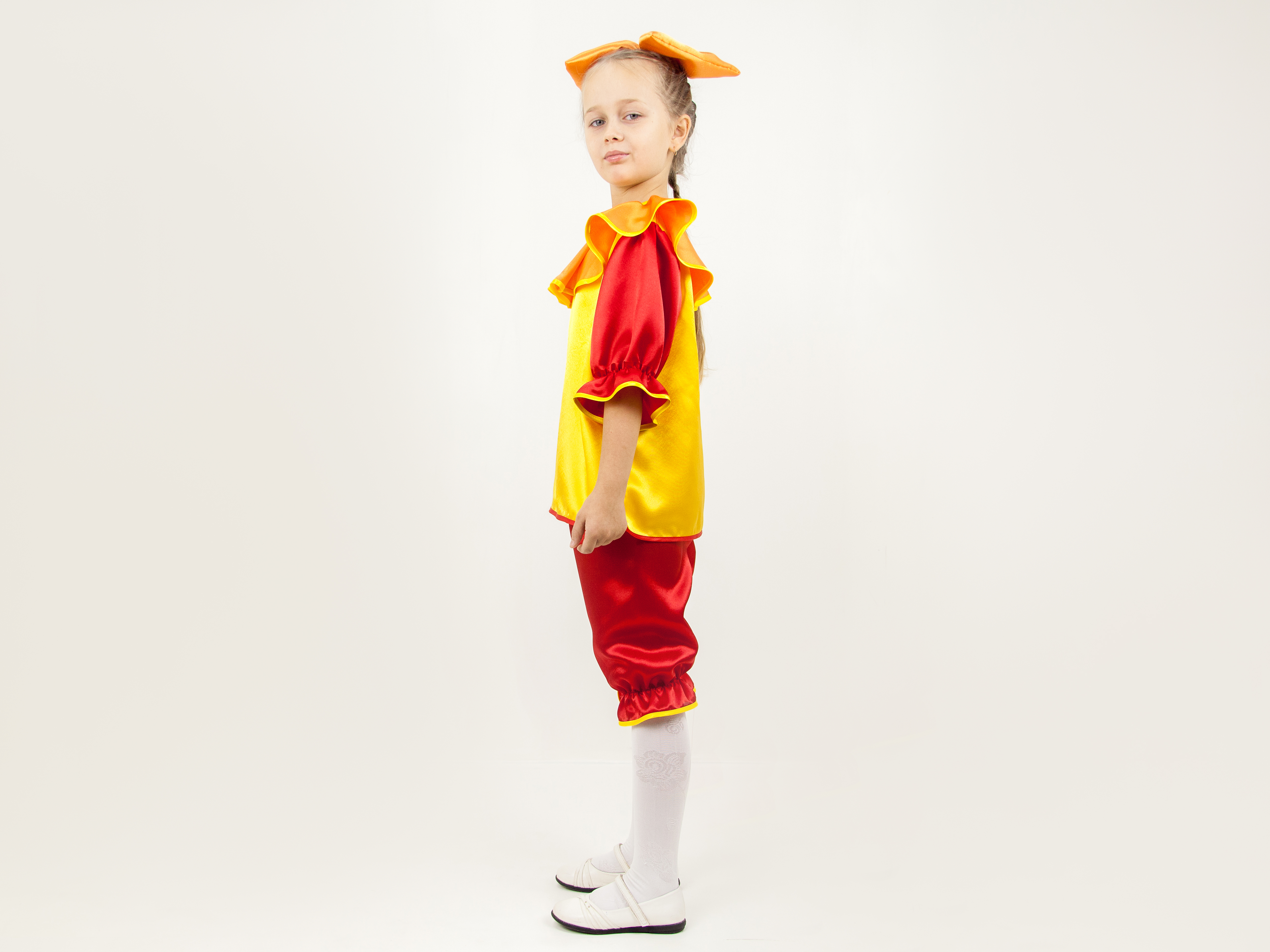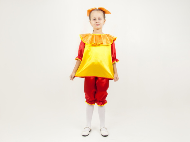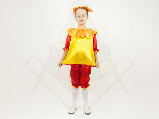 Состав — крепсатин 100% полиэстер. Комплектация — блуза с заствежкой сзади, рукавчики на резинке, штанишки — резинка на поясе и по низу штанин, бант — на резинке для волос.