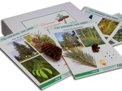 В коллекции представлены побеги, шишки и семена хвойных растений. Натуральные образцы сопровождаются фотографиями взрослых растений. Планшеты формата А4 изготовлены из картона и ламинированы глянцевой пленкой.