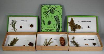 В коллекции представлены 5 видов голосеменных растений (сосна обыкновенная, кипарис, лиственница, ель, можжевельник) в виде натуральных объектов – ветки (кроме ветки ели), семена (кроме семян можжевельника), шишки, наклеенных на планшеты, с обратной стороны планшетов есть картинки и пояснительный текст к данному растению. Наиболее целесообразно использовать коллекцию в качестве раздаточного материала, предложив учащимся следующие задания: рассмотрите внешнее строение побегов; рассмотрите строение шишек; рассмотрите семена; в чем различие и сходство побегов, шишек, семян; как распространяются семена этих растений; как семена расположены в шишках. Коллекция может быть использована в курсе природоведения и географии при изучении различных природных зон.